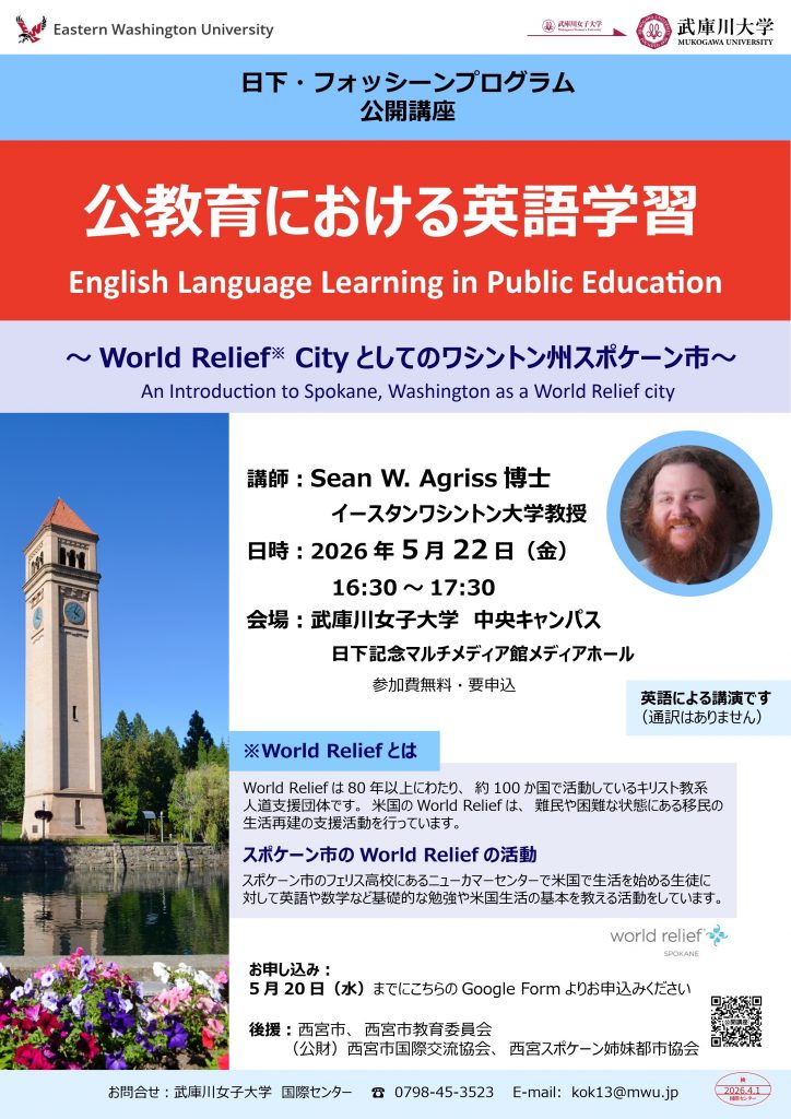 5月22日(金)に、本学の協定校である、米国・イースタン ワシントン大学のショーン・アグリス教授をお招きして、公開講座を行います。アグリス教授は、英語教育を専門とされ、当日は「公教育における英語学習」についてご講演いただきます。講演は英語で行います。